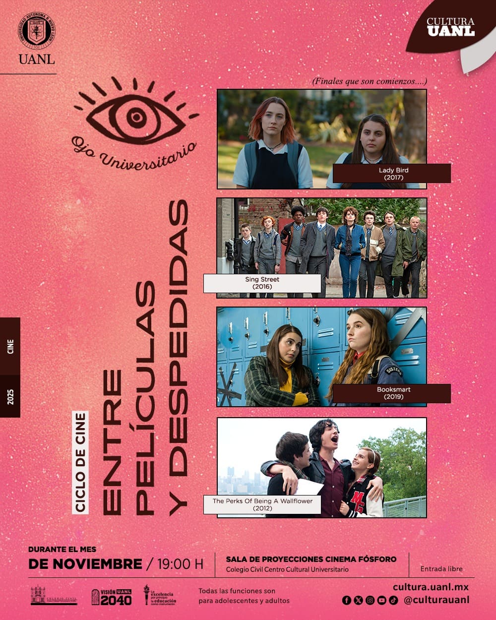 La Universidad Autónoma de Nuevo León, a través de la Secretaría de Extensión y Cultura con su Cineclub “Ojo Universitario”, Te invita al Ciclo de cine: “Entre películas y despedidas”