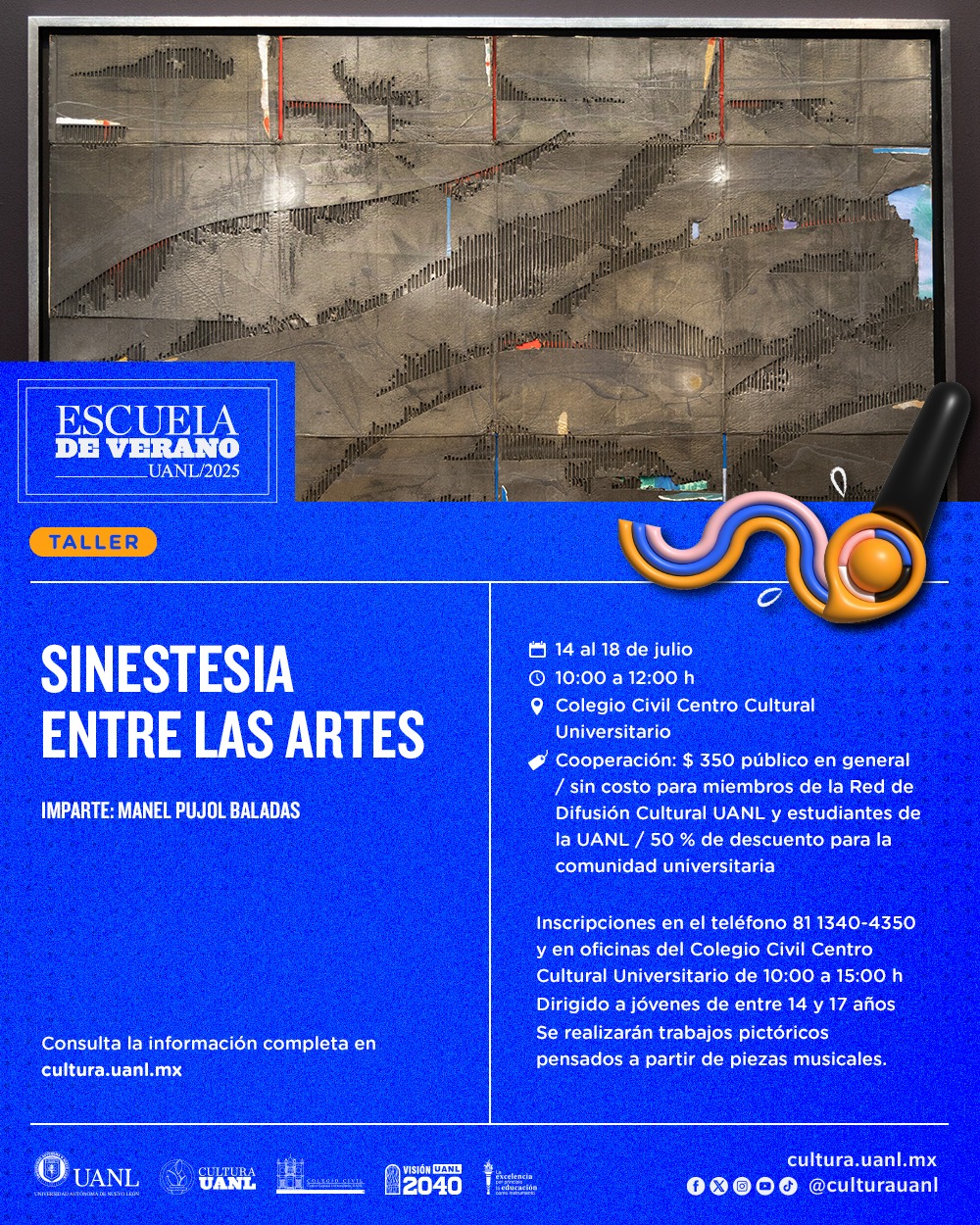 La Universidad Autónoma de Nuevo León, a través de la Secretaría de Extensión y Cultura con su Escuela de Verano te invita al taller de Sinestesia entre las artes.